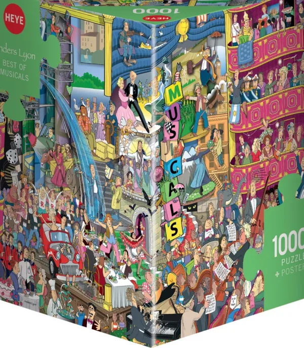 Puzzle 1000 pièces. Best of Musicals de la marque HEYE, de la série Cartoon Boîte triangulaire et de l’artiste Anders Lyon – Dimensions du puzzle monté : 50 cm x 70 cm – Label FSC (ce label environnemental a pour but d’assurer que la production de bois ou d’un produit à base de bois respecte les procédures garantissant la gestion durable des forêts)