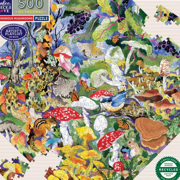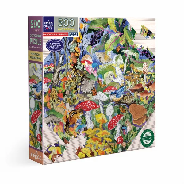 Les puzzles Eeboo sont faits à 90% de cartons recyclés, et imprimés avec des encres végétales pour un impact environnemental limité. Puzzle octogonal de 500 pièces. modèle inclus. Une aquarelle luxuriante de Hazel Jarvis propose une image de mise en garde sur certaines variétés toxiques de champignons, avec des notes d’identification incluses. Associez-le à notre puzzle de champignons comestibles (PZFOEM). Illustré par Hazel Jarvis. Dimension boite : 25 x 25 cm Dimension puzzle 51.6 cm de côté