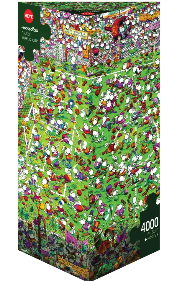 Puzzle 4000 pièces. Crazy World Cup de la marque HEYE, de la série Cartoon Boîte triangulaire et de l’artiste Guillermo Mordillo – Dimensions du puzzle monté : 96 cm x 136 cm – Label FSC (ce label environnemental a pour but d’assurer que la production de bois ou d’un produit à base de bois respecte les procédures garantissant la gestion durable des forêts)