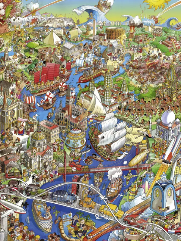 Puzzle 1500 pièces. History River de la marque HEYE, de la série Cartoon Boîte triangulaire et de l’artiste Hugo Prades – Dimensions du puzzle monté : 60 cm x 80 cm – Label FSC (ce label environnemental a pour but d’assurer que la production de bois ou d’un produit à base de bois respecte les procédures garantissant la gestion durable des forêts)