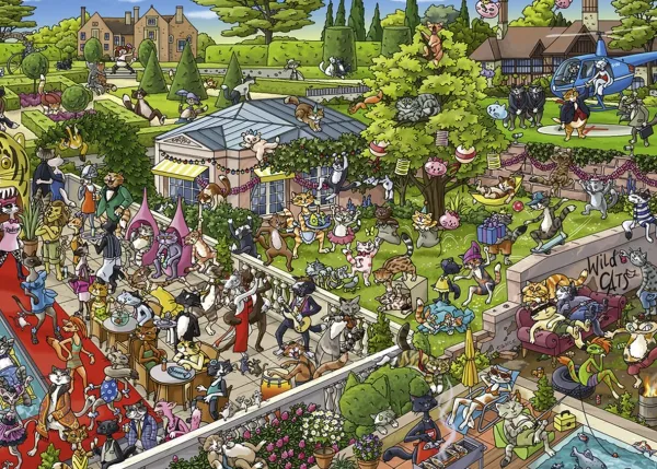 Puzzle 1000 pièces. Party Cats de la marque HEYE, de la série Cartoon Boîte triangulaire et de l’artiste Birgit Tanck – Dimensions du puzzle monté : 50 cm x 70 cm – Label FSC (ce label environnemental a pour but d’assurer que la production de bois ou d’un produit à base de bois respecte les procédures garantissant la gestion durable des forêts)