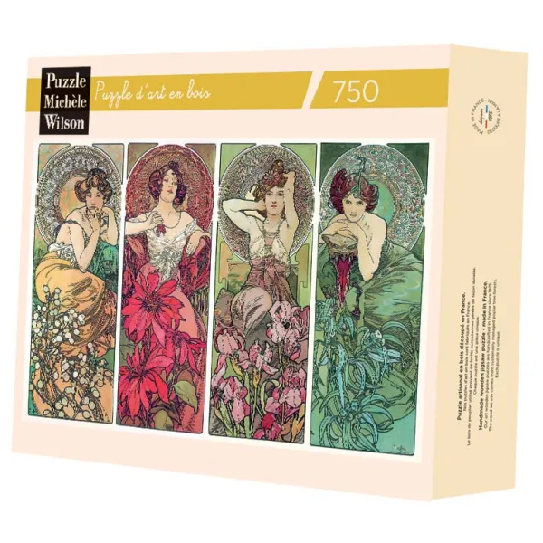 Puzzle d’art en bois de 750 pièces environ, découpé à la main en France respectant l’environnement. Alfons Mucha est un affichiste, peintre, illustrateur et graphiste tchèque, chef de file du mouvement Art nouveau. Chaque panneau de ce quadriptyque met en valeur une pierre précieuse : la topaze, le rubis, l’améthyste et l’émeraude. La découpe souligne la composition des panneaux : les fleurs aux premiers plans, les jeunes femmes aux deuxièmes plans et les mosaïques rondes aux troisièmes plans. Dimensions : 50 x 30 cm environ